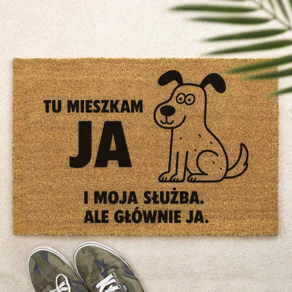 Zabawna wycieraczka kokosowa z napisem „TU MIESZKAM JA I MOJA SŁUŻBA, ALE GŁÓWNIE JA” to obowiązkowy element wyposażenia każdego domu, w którym PIES rządzi niepodzielnie. Idealnie sprawdzi się przed drzwiami wejściowymi, skutecznie zatrzymując brud i jednocześnie wywołując uśmiech na twarzach gości, kurierów i sąsiadów. To także świetny pomysł na prezent dla psiarzy i osób z poczuciem humoru.