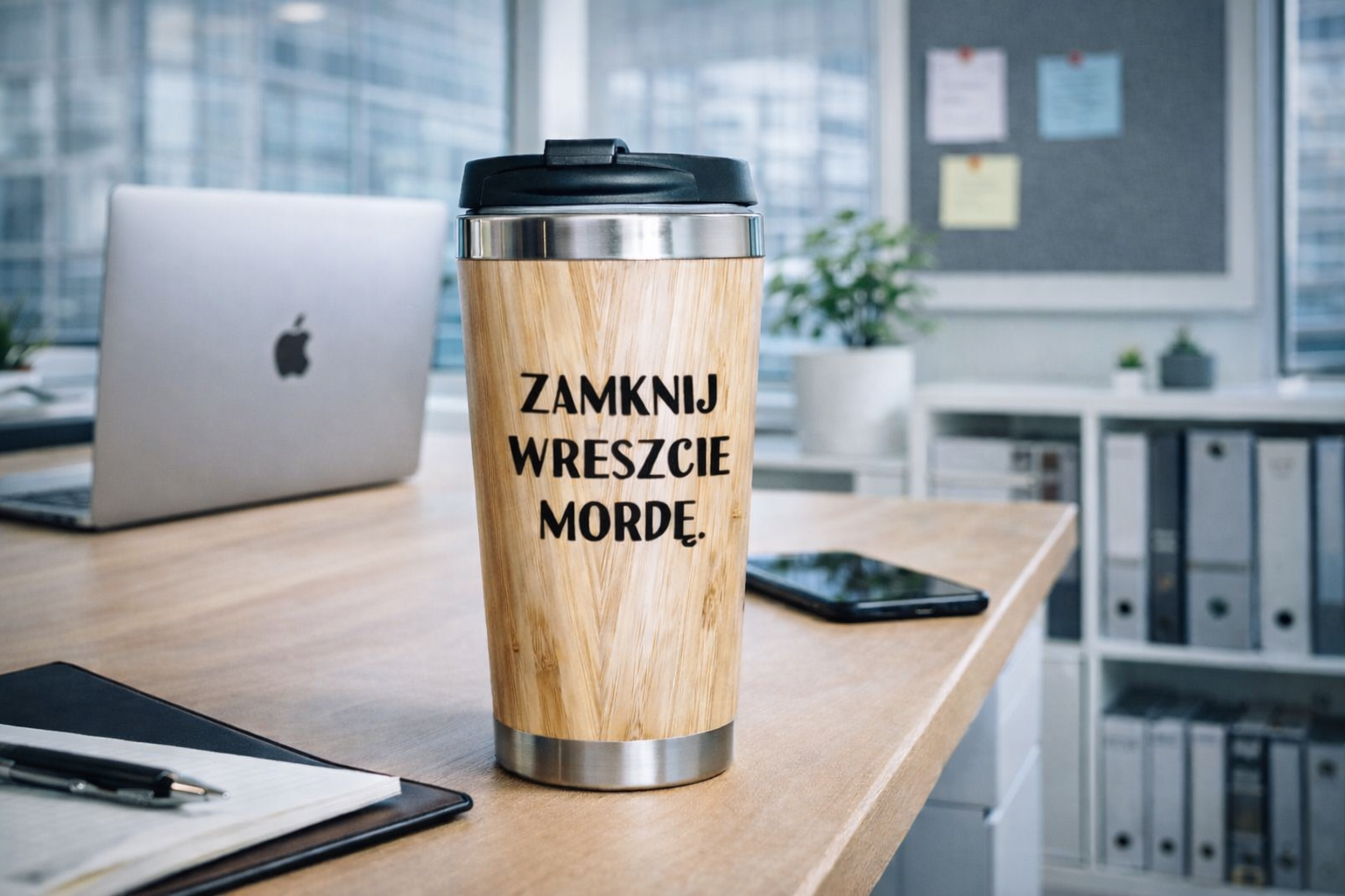 Szukasz prezentu, który naprawdę wyróżni się na tle nudnych gadżetów? Bambusowy kubek termiczny „Zamknij Wreszcie Mordę” to propozycja dla osób z mocnym poczuciem humoru i dystansem do codziennych sytuacji – szczególnie tych biurowych.